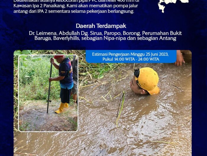 Perumda Air Minum (PDAM) Kota Makassar memberikan informasi adanya pengerjaan pipa PVC diameter 400 mm di Kawasan IPA II Panaikang, Minggu (26/06/2023).
