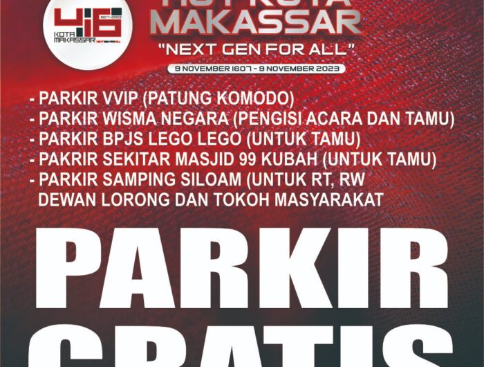 MAKASSAR, SULSELPASTI.COM — PD Parkir Makassar Raya menyiapkan lima kantong parkir gratis bagi masyarakat dan tamu yang akan menyaksikan puncak Peringatan HUT Kota Makassar ke-416, Kamis (2/11/2023).