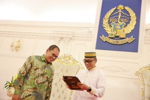 Danny mengenakan batik hijau dan celana hitam. Sementara Pj Gubernur mengenakan pakaian putih dengan Songkok Recca khas Sulsel.
