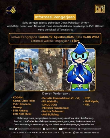 Dalam keterangannya, Kabag Humas PDAM Makassar, Idris Tahir mengatakan rencana pengerjaan akan dilakukan hari Sabtu (10/09/2024) pukul 10.00 Wita, dengan estimasi waktu pengerjaan selama 6 jam.