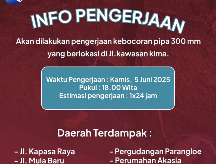 MAKASSAR, SULSELPASTI.COM — Perumda Air Minum (PDAM) Kota Makassar melakukan pengerjaan perbaikan kebocoran pipa berdiameter 300 mm di Jalan Kawasan KIMA. Pengerjaan dimulai Kamis, 5 Juni 2025, pukul 18.00 WITA dan ditargetkan selesai dalam waktu 1×24 jam. Selama proses ini berlangsung, distribusi air akan mengalami gangguan sementara di beberapa wilayah sekitar.