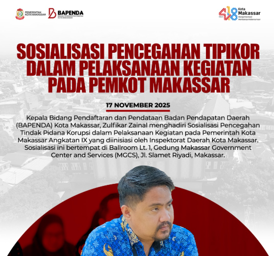 SULSELPASTI.COM – – Kepala Bidang Pendaftaran dan Pendataan Badan Pendapatan Daerah (BAPENDA) Kota Makassar, Zulfikar Zainal, menghadiri Sosialisasi Pencegahan Tindak Pidana Korupsi dalam Pelaksanaan Kegiatan pada Pemerintah Kota Makassar Angkatan IX. Kegiatan ini diinisiasi oleh Inspektorat Daerah Kota Makassar dan berlangsung di Ballroom Lt. 1, Gedung Makassar Government Center and Services (MGCS), Jalan Slamet Riyadi, Makassar.