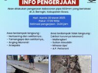 MAKASSAR, SULSELPASTI.COM – Telah terjadi kebocoran pipa 400mm, yang berlokasi di Jalan Perintis Kemerdekaan (Depan […]